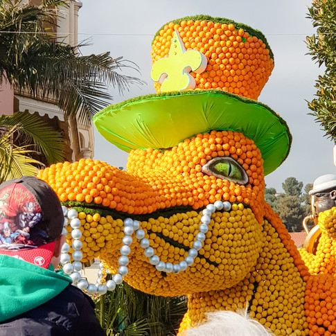 Cette année, la Fête du Citron de Menton avait pour thème : les Fêtes du Monde. Une fête qui célèbre les autres fêtes, comme quoi il n'y a pas de concurrence entre elles. L'occasion de voir des chars mettant en avant les carnavals de Rio ou de Venise, la Saint-Patrick, la Fiesta de los Muertos, etc.